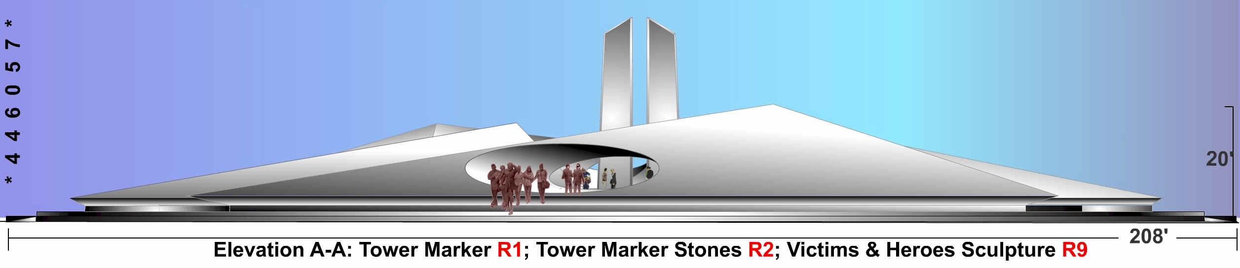 Among the significant elements of the design are the TOWER MARKERS (R1) and MARKER STONES (R2): Four Triangular (Truss) Shaped Monolithic Structures in seamless aluminum finish as per original Towers (or stone if necessary) on stepped up base define Original Footprint of each Tower and the sanctity of the inner area around the Twin Granite Marker Stones that have the names of all Victims inscribed on them . Bottom edges are set inward for appearance of floating above ground. The large "Tunnels"( R1a) passing through these Structures allow physical passage," views and light", contemplation areas and numerous powerful symbolic reminders including "That which has been taken from us yet still the strength and determination to continue on toward the future despite our loss." . Space inside the individual structures meet requirements for Remains of Unidentified Victims, and Private Areas for Families of Victims and additional needs. Semicircular areas provide for more secluded contemplation. The